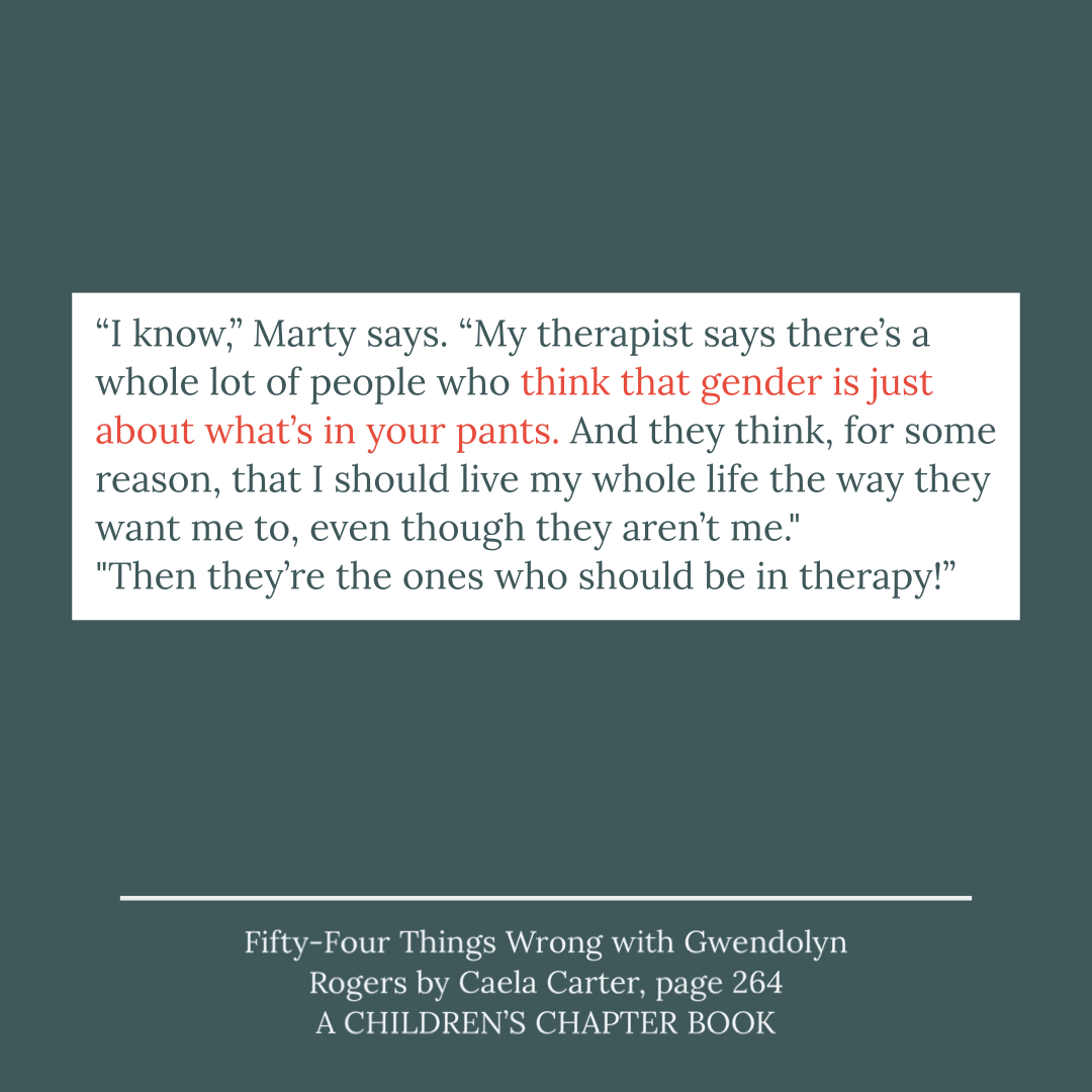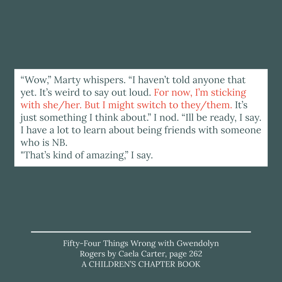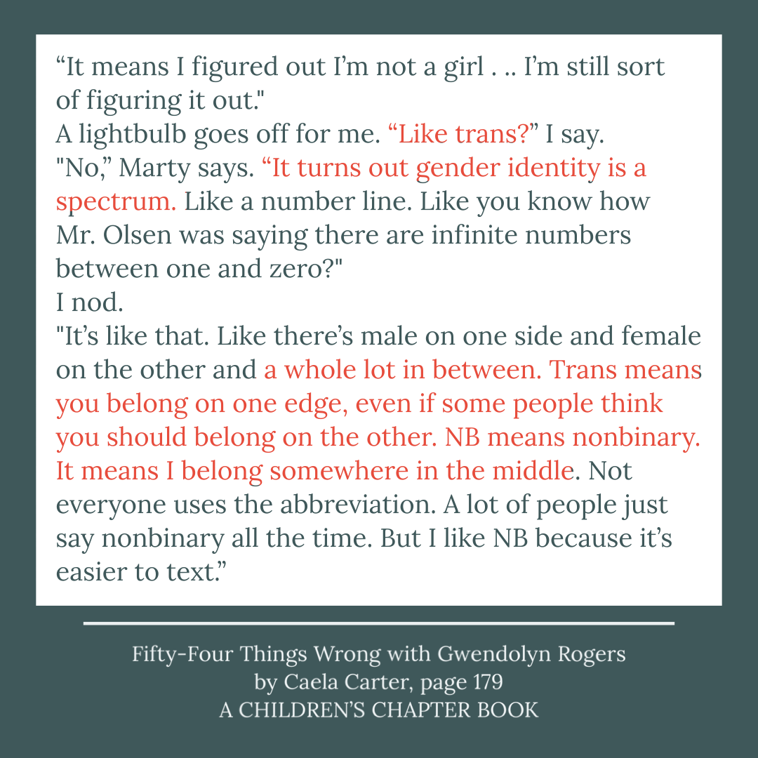A book called Fifty-Four Things Wrong with Gwendolyn Rogers by Caela Carter was brought to my attention by my friend Crystal Duval whose daughter, a student at a Tom Cox Intermediate, was reading the book. The book has nothing in the description or inside flap to indicate that there were gender spectrum themes in this book.